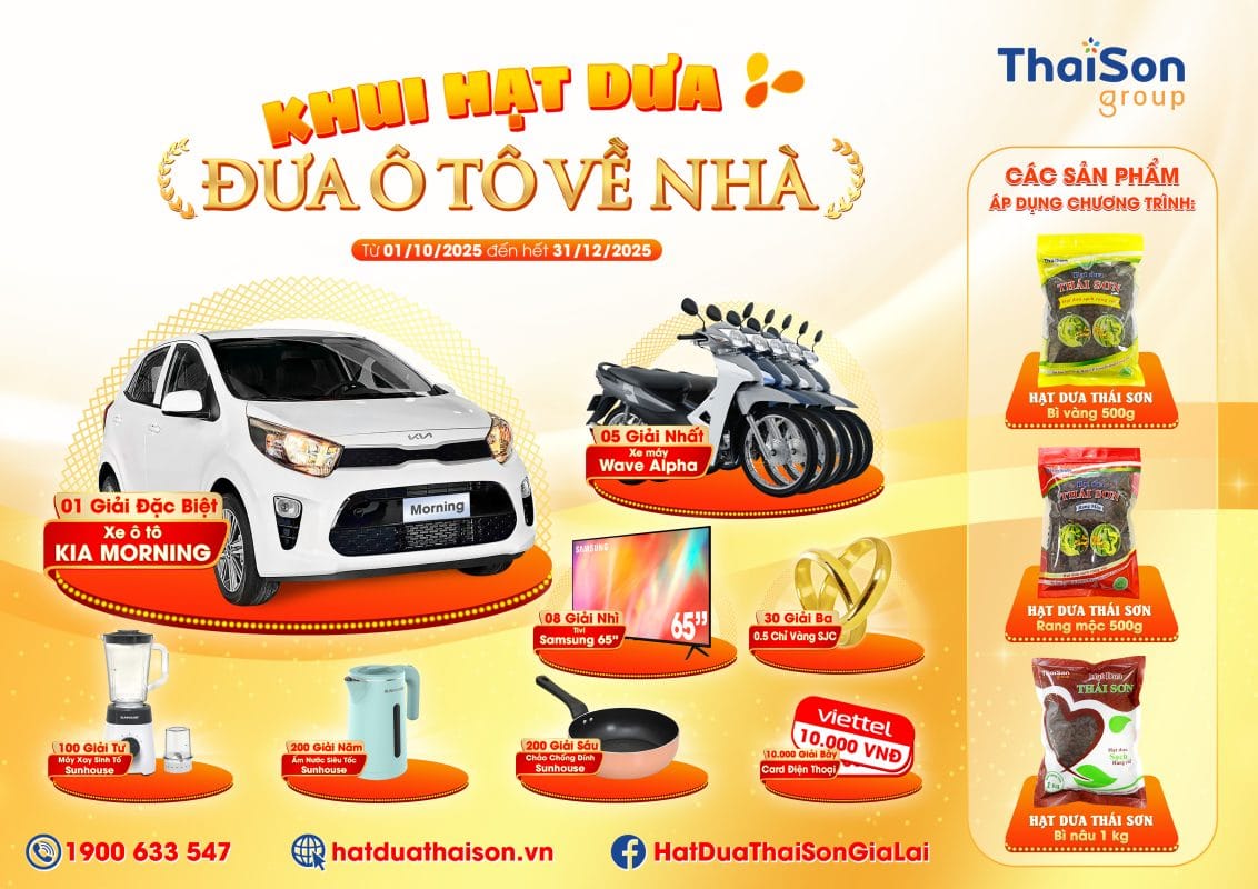 Với mong muốn gửi lời tri ân sâu sắc nhất đến hàng triệu khách hàng đã luôn tin tưởng và đồng hành, Hạt Dưa Thái Sơn trân trọng thông báo chính thức khởi động chương trình khuyến mại lớn nhất trong năm mang tên “Khui Hạt Dưa – Đưa Ô Tô Về Nhà”